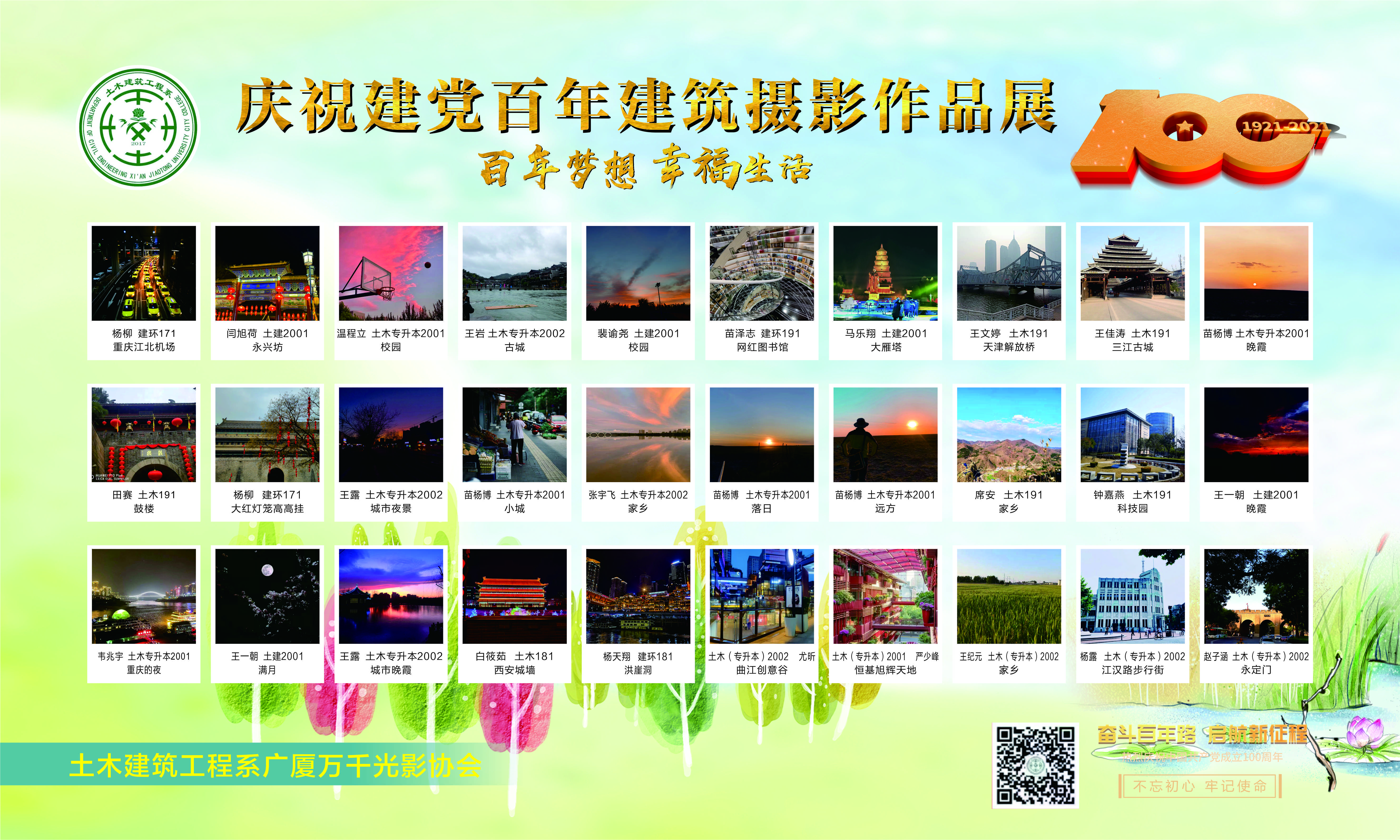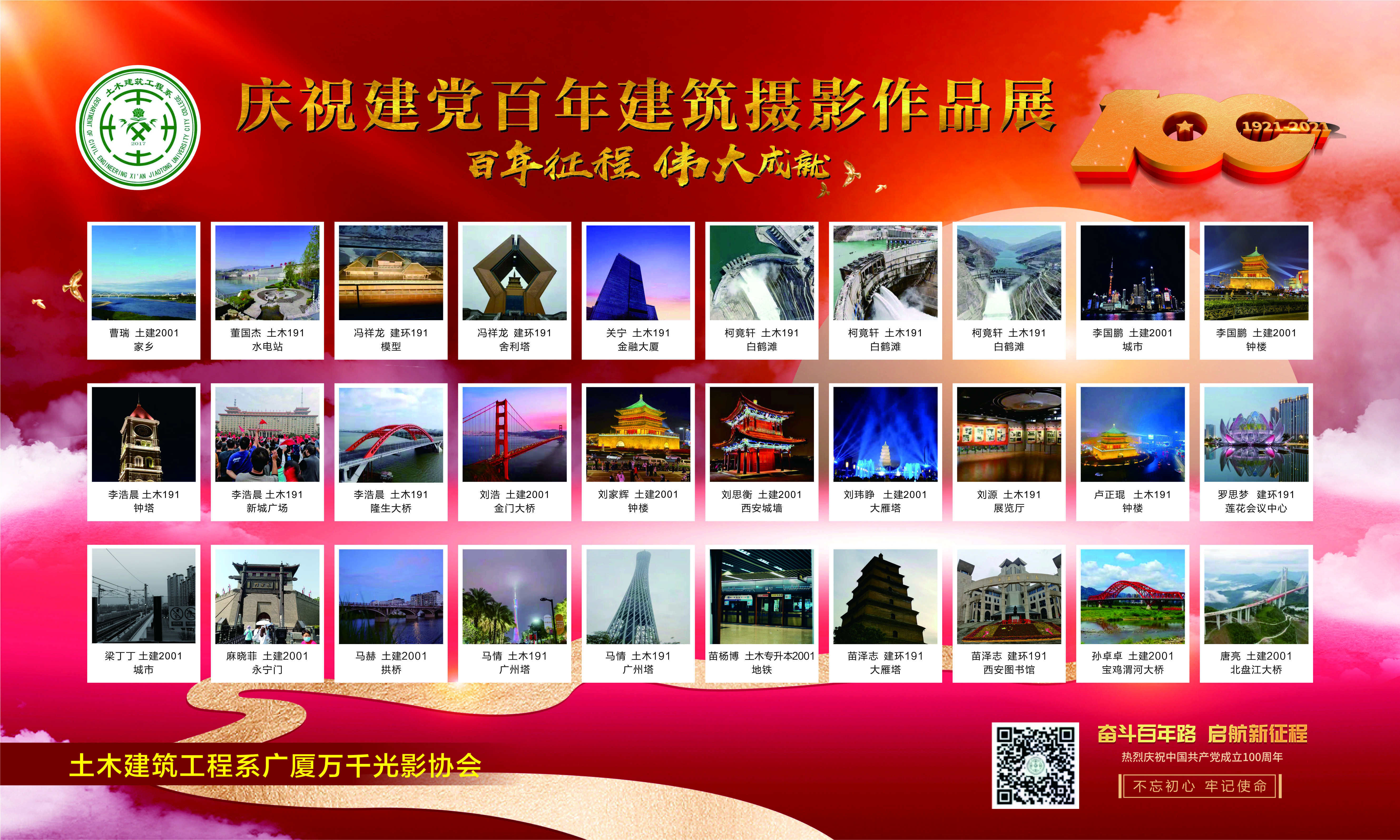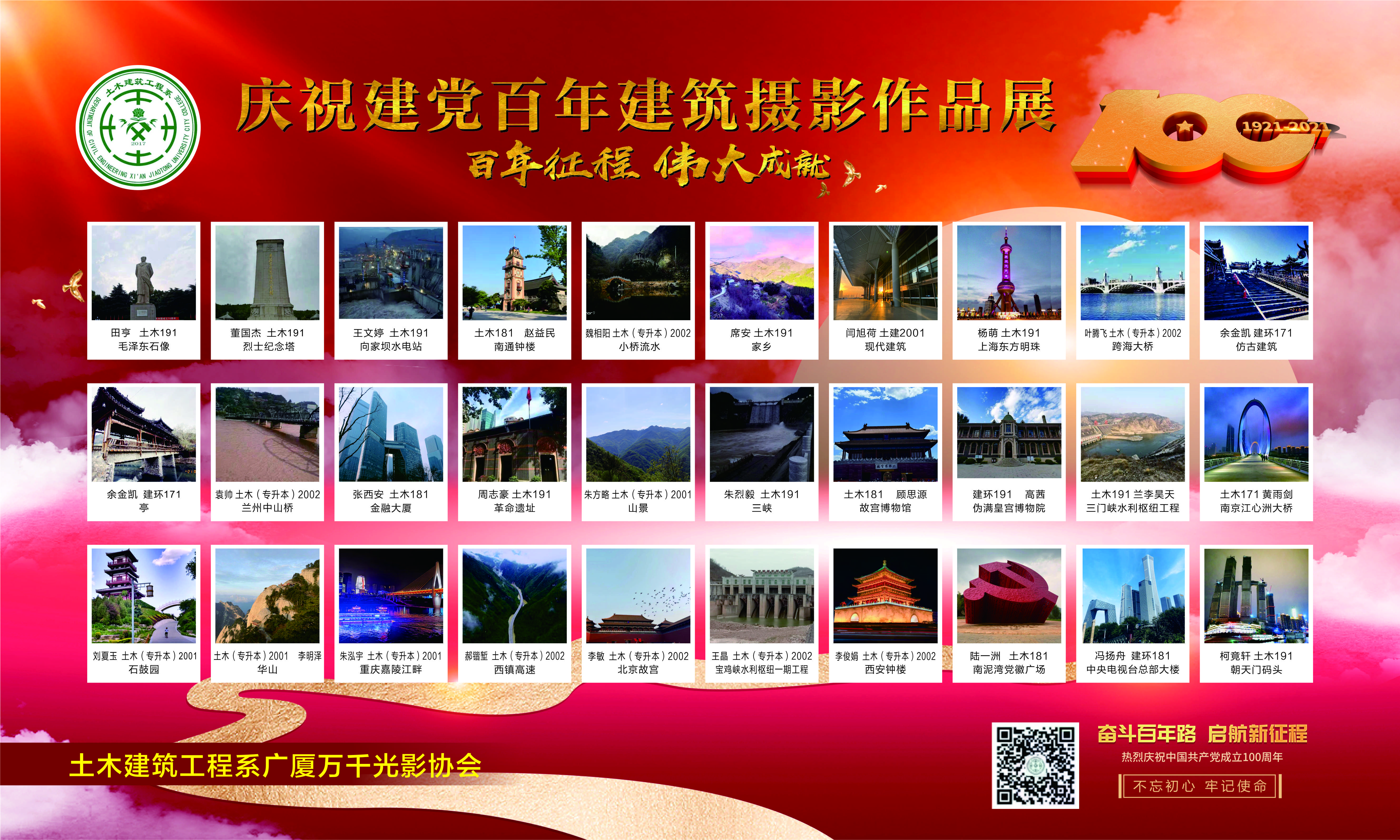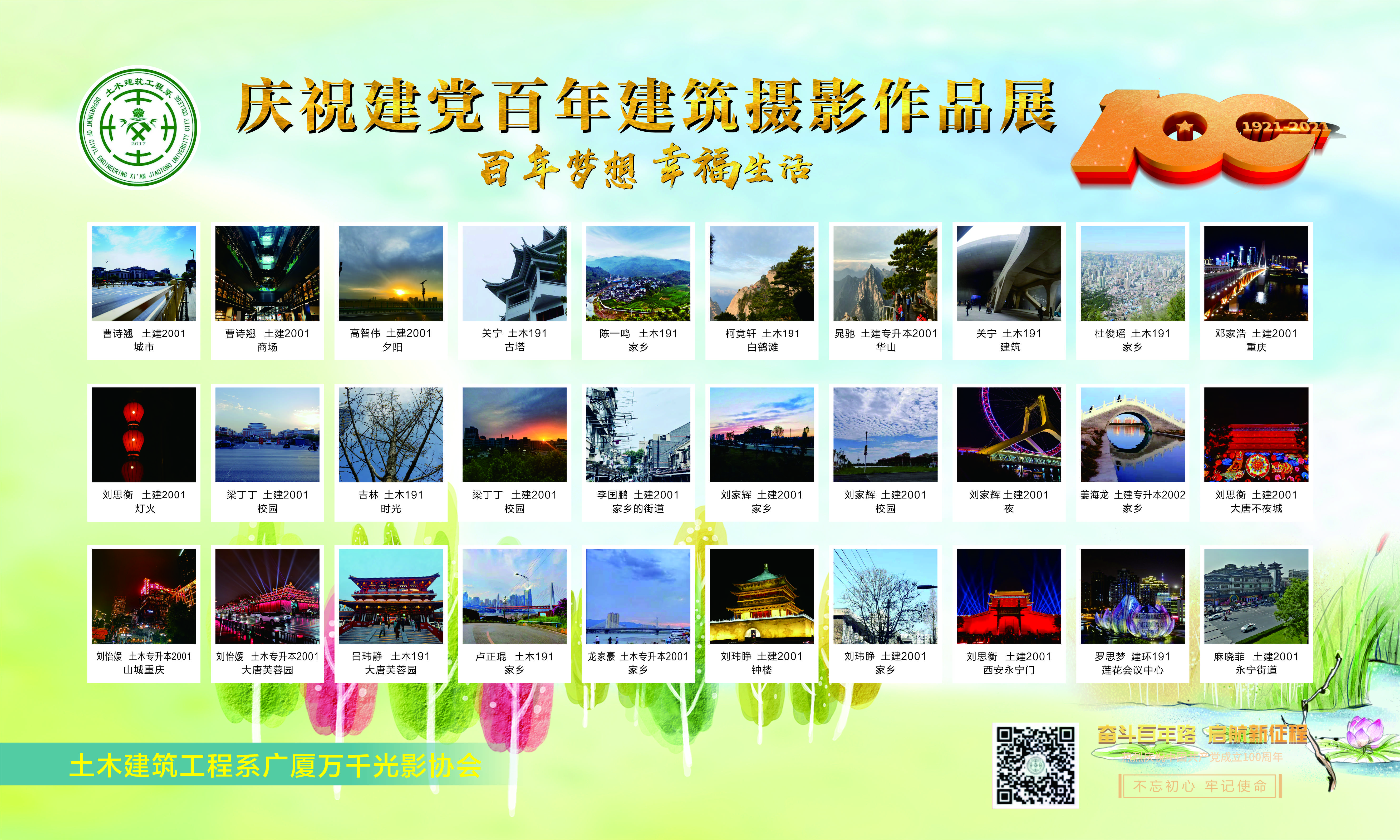 为庆祝中国共产党成立100周年,展现党的伟大成就及党领导全国人民创造的幸福生活,西安交大伟德betvlctor1946源于英国土木建筑工程系“广厦万千”建筑光影协会学生社团在本学期举办了“百年征程、百年梦想”摄影大赛,并将征集的优秀作品在“7.1”前后进行了为期一周的展出,营造欢庆氛围。
