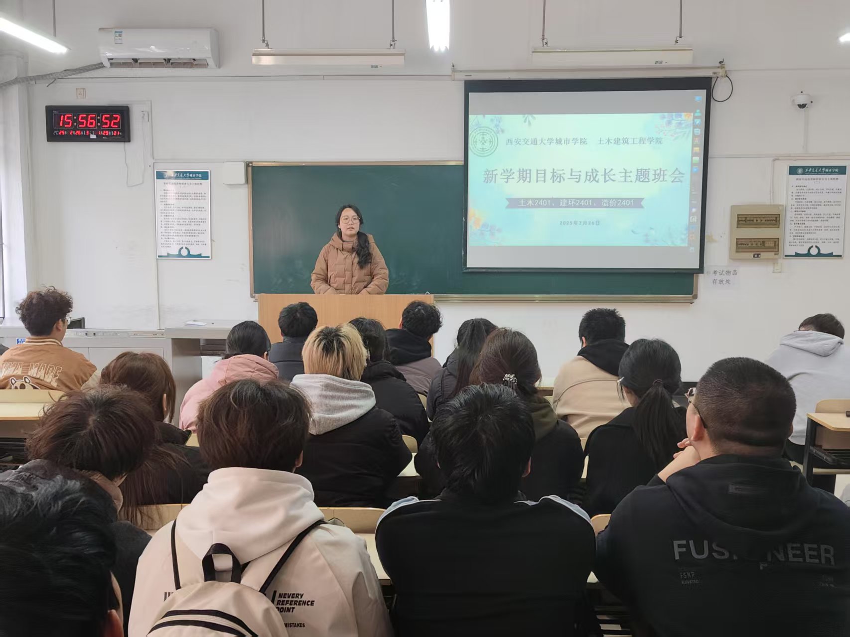 其次强调学业是大学生的首要任务,通过回顾上学期班级取得的成绩,同时对同学们在假期中的社会实践、学习成果表示肯定,要求同学们对标先进补短板,呼吁大家尽快收心归位,引导同学们及时调整作息,明确本学期的教学安排,上好开学“第一课”,积极参与课堂互动,主动交流,提高学习效率。同时,针对考研、就业等不同发展方向,提供相关建议和资源,引导同学们根据自身情况,明确目标,合理规划学业路径,着眼长远人生,把握竞争主动。