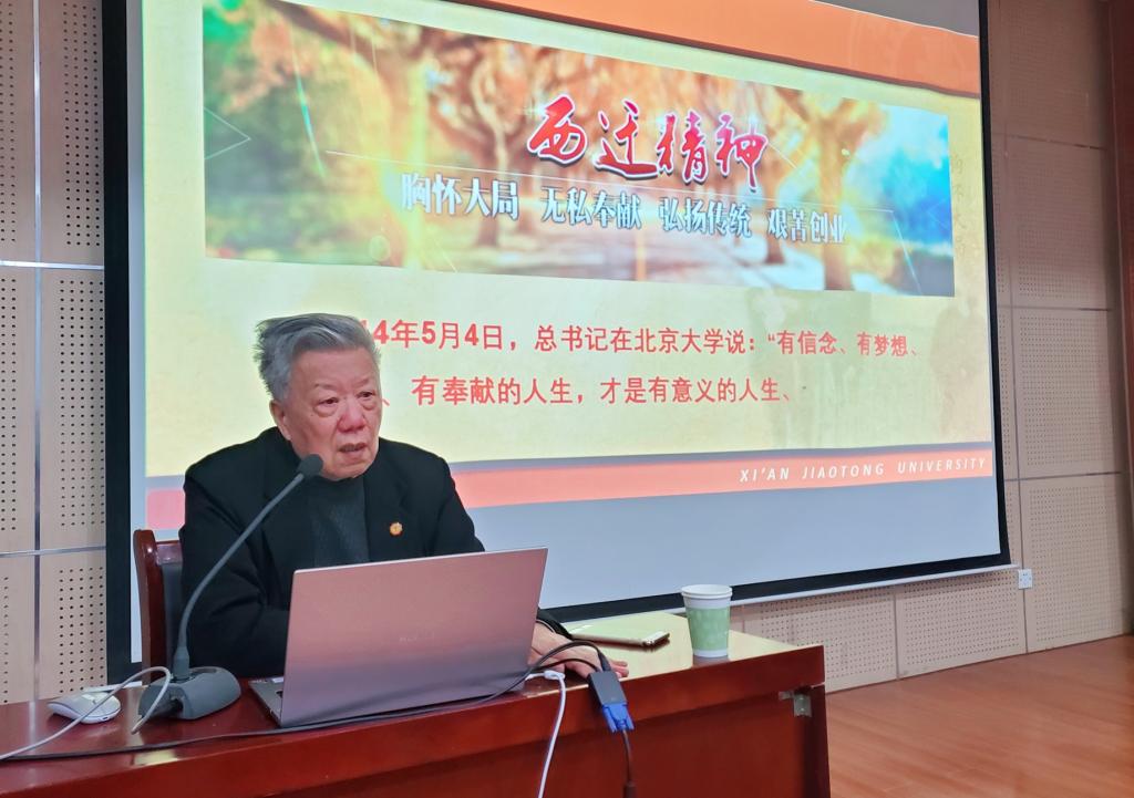 在师生共同观看了央视对朱继洲教授参与的《向西,向远方》专题访谈后,朱教授展开了精彩讲授,他以习近平总书记西安交大视察讲话和亲切会见写信西迁老教授为切入点,深刻阐述了总书记的讲话精神和嘱托。随后朱教授结合自己随行西迁的经历,为师生讲解了交大西迁的历史背景,以及西安交大西迁60多年来的发展历程和取得的巨大成果,展现出交大人心系祖国发展建设,向科学进军,建设大西北的责任和豪情。朱教授在报告中还多次强调要树立“听从党和国家的召唤,党让我们去哪里,我们就背起行囊去哪里”的精神理念,为国家建设服务,在国家“两个一百年”建设和西部大开发做出更大的贡献。最后,朱教授结合央视专题报道《赤子心,西迁情》,为师生进一步的解析了“胸怀大局、无私奉献、弘扬传统、艰苦创业”的“西迁精神”,勉励同学们牢记总书记的嘱托,传承和弘扬“西迁精神”,做有信念、有梦想、有奋斗、有奉献的新时代“四有新人”。整场报告,在座师生多次为朱教授送上阵阵掌声,致敬西迁老教授,支部党员还为朱教授送上鲜花,以表崇高的敬意和感激之情。